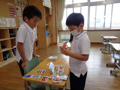 今日ののびのびタイムは体育館が使えたので、4年生と一緒にバナナおにごっこをしている子、国旗カルタでいろいろな国の特徴や国旗を覚えている子、みんなが過ごしやすいようにと教室のごみを掃いたり、黒板をきれいにしたりしている子と、思い思いに楽しく過ごしていました。