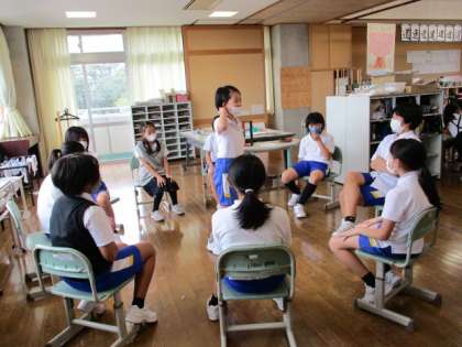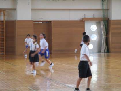 体育館では、3年生と4年生が一緒に鬼ごっこをしていました。5年生はフルーツバスケットの遊びを楽しんでいました。