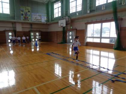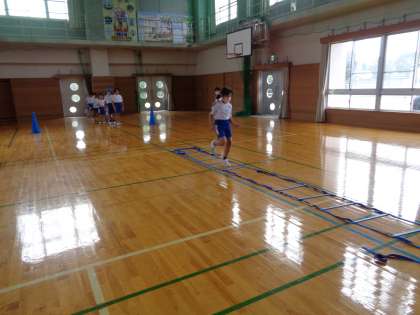 ラダーを使って、リズムよく足を高く上げて走ったり、マーカーが置かれたくねくねコースを素速く走ったりしました。