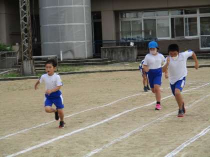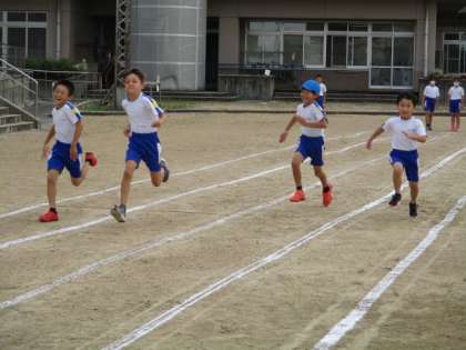 火曜の朝活動はチャレンジタイムです。3、4年生は短距離走に取り組みました。