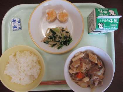 今日の献立は、ごはん、牛乳、にんじんシューマイ、小松菜ひたし、八宝菜、ポケットチーズです。八宝菜は具だくさんでとても美味しいです。