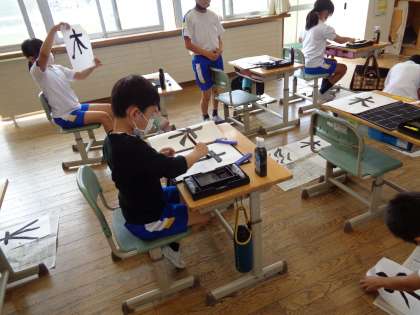 手本の動画を見ながら「すべり台みたいな形をしているね」「払う前に、一回止まっていたよ」と書き方の特徴に気付き、それを意識して練習していました。