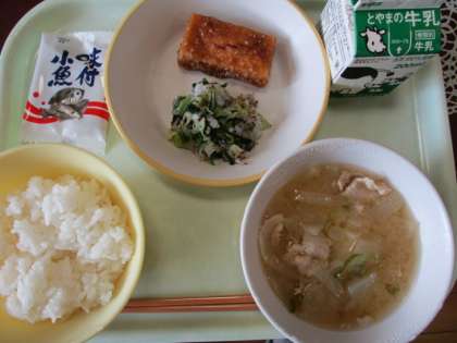 今日の献立は、ごはん、牛乳、揚げ出し豆腐のごまだれかけ、ゆかり和え、豚汁、味付け小魚です。