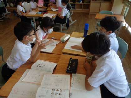 国語の学習で、いろいろな意味をもつ言葉を学習しました。自分の作った問題をグループの友達に紹介しました。