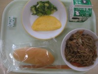 今日の献立は、ごはん、牛乳、赤魚の塩焼き、卵ときくらげの炒め物、炊き合わせです。