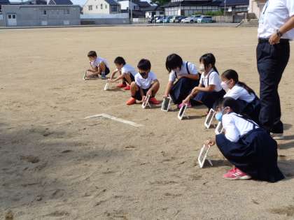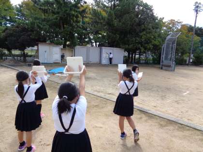 太陽の光を鏡ではね返したり重ねたりして、温度を確かめました。光が集まっているところを触って、温かくなっていることに気付きました。的から離れて、遠くから跳ね返している子もいました。