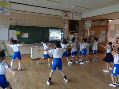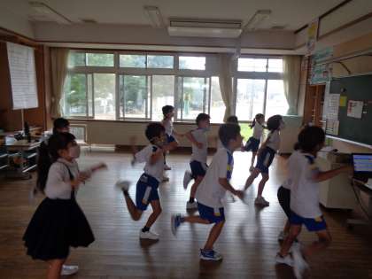 今日の朝チャレは、あいにくの雨のため、教室でリズム体操をしました。画面に釘付けになって踊る子供たち。やっぱり朝から体を動かすとすっきりするね!