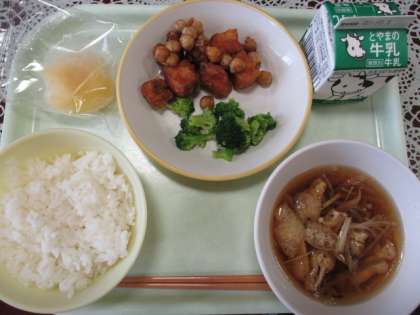 今日の献立は、ごはん、牛乳、魚とひよこ豆の甘からめ、ゆでブロッコリー、沢煮椀、冷凍りんごです。