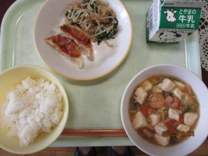 今日の献立は、ごはん、牛乳、焼きぎょうざ、ナムル、えびと豆腐のうま煮です。