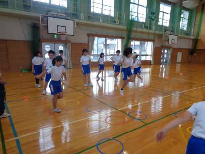 今日は午前中の間、スポーツ指導員の方に来ていただき、コオーディネーショントレーニングの指導を受けました。5年生の子供たちは、相手とタイミングを合わせて走る運動や、スカーフなどの道具を用いた運動を行いました。頭を働かせながら汗をかき、充実した時間になりました。