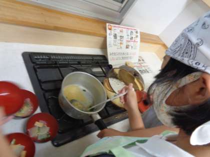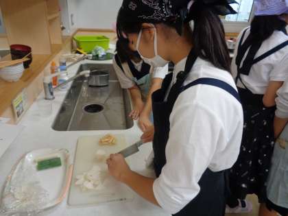 ご飯と味噌汁の実習をしました。味噌汁の実を切るだけでも、とても大変な様子でした。「毎日ご飯をササッと作っている家族はすごいなあ」とこぼしている子どもがいました。