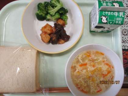 今日の献立は、食パン、牛乳、鶏肉とレバーのマーマレードソースからめ、ゆでブロッコリー、コーンと卵のスープです。コーンがたっぷり入ったスープが美味しいです。