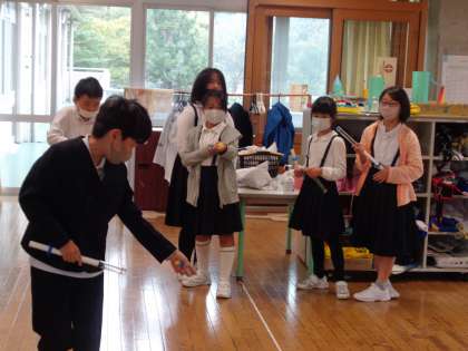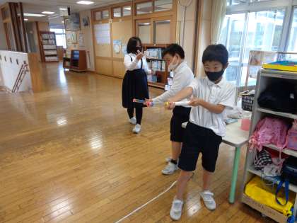 理科の学習でスポンジの玉をプラスチックの筒を使って飛ばしました。どのように玉をいれたら遠くに飛ぶか試しながら楽しみました。