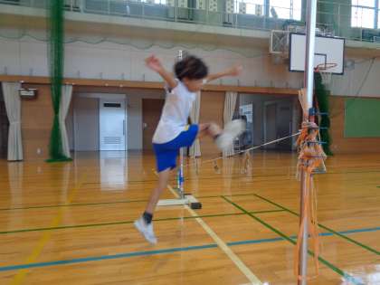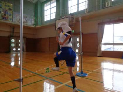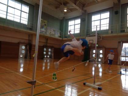 体育科『高跳び遊び』の授業では、ゴムを使って高跳びをしました。カエル、ウサギ、カンガルーの3つのレベルを設定し、どんな跳び方で跳ぶと高く跳ぶことができるのか考えながら取り組みました。助走をつけたり、ベリーロールで跳んでみたり、自分で跳びやすい方法を見つけることができました。