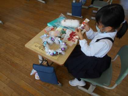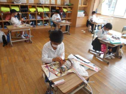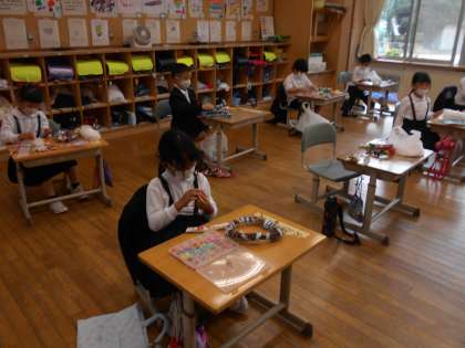 生活科の時間にアサガオのつるを使ってリース作りをしています。リースにつける物を家からもってきて、リースに飾り付けをしていました。