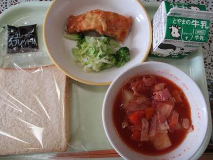 秋晴れの気持ちのよい一日です。今日の献立は、食パン、牛乳、魚のえごま揚げ、そえ野菜、豆とベーコンのトマト煮、チョコレートクリームです。えごま揚げはかりっと揚がっていてとても美味しかったです。