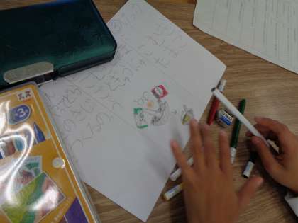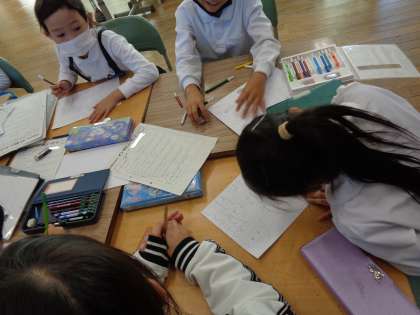町探検で「大塚屋」と「七福亭」でインタビューした結果を、各グループに分かれてまとめています。大塚屋グループは、本のように製版して読めるように、七福亭グループは、大きな紙で掲示ができるように、工夫して作成しています。できあがりが楽しみです。
