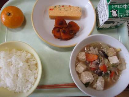 肌寒い一日です。今日の献立は、ごはん、牛乳、ちぐさ焼き、かぼちゃのいとこ煮、白菜鍋、みかんです。鍋の美味しい季節になってきました。