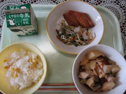 今日の献立は、栗おこわ、牛乳、赤魚の照り焼き、香味和え、筑前炊きです。秋の味覚、栗が入ったおこわで季節を感じることができました。