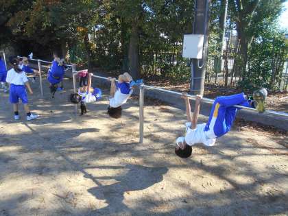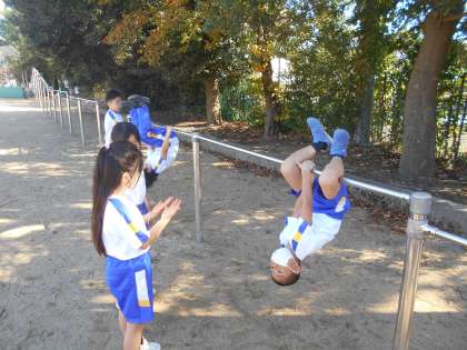 体育の時間に鉄棒遊びをしました。つばめ、前まわり、逆上がりやコウモリおりができる子もいました。