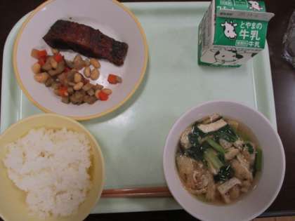 今日の献立は、ごはん、牛乳、魚の甘みそかけ、五目煮豆、うすくず汁です。うすくず汁には、鶏肉、椎茸、薄揚げ、小松菜が入っていました。