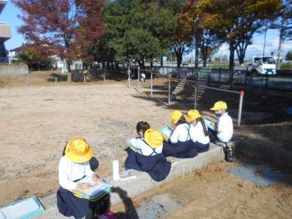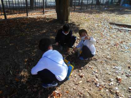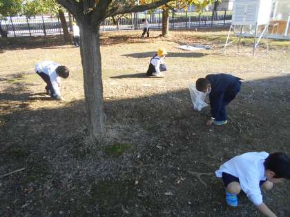 午後、生活科の時間に秋みつけをしました。ドングリを拾ったり色づいた木を観察したりしました。