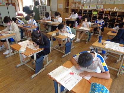 書写の学習で、漢字や平仮名の文字の大きさに気をつけて文章を書きました。丁寧に書こうと頑張りました。