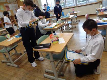 図工の時間には、友達の作品を鑑賞し、「いいな」「まねしたいな」ということを見付け合いました。