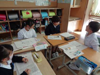 国語科では、自分の相談ごとについてグループで話し合い、解決策を伝え合うという活動を行っています。話合いの進め方について動画を見ながら学習し、話し方や聞き方を再確認しました。丁寧な話し方や姿勢に気をつけて取り組んでいます。