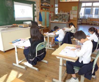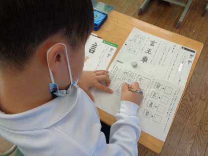 漢字勉強や書写の時間は特に、姿勢や鉛筆の持ち方に気をつけて学習に取り組んでいます。書写では、自分の納得がいくまで、何度も書き直しをする姿が見られ、どんどんとバランスのよい字を書くことができるようになってきました。