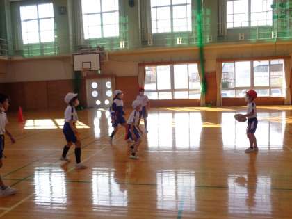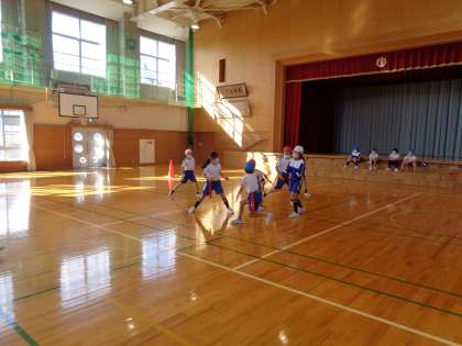 「なかなかゴールまで行けないな」「赤団はみんなで協力してパスを回しているね」と初めてのゲームに戸惑いながらも、次のゲームに向けて作戦を考えていました。