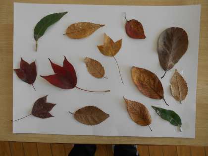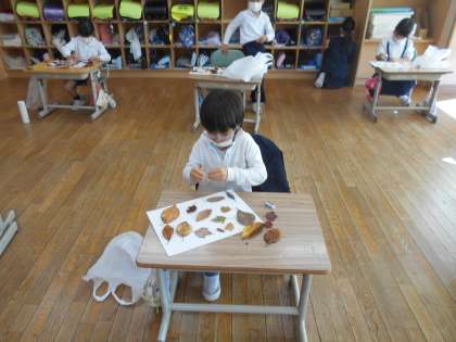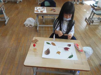 生活科の時間に集めた落ち葉を葉の色や形、大きさをみながら画用紙にはりました。