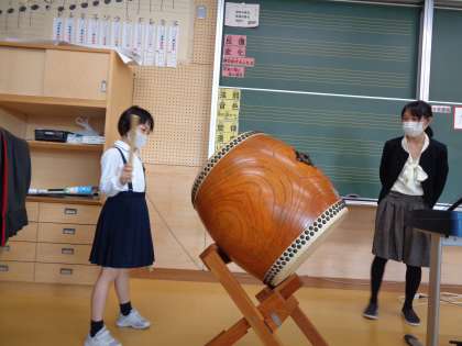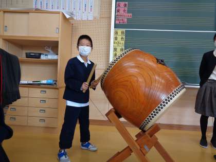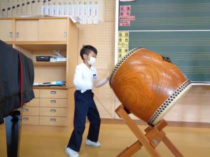 音楽科では、今日から太鼓のリズム打ちの授業が始まりました。今日は、みんな太鼓に触れることからスタートし、優しく打ったり、両手で打ったりして音の違いを楽しみました。