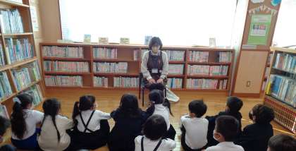 図書館へ招待していただき、たくさんの本を読み聞かせしていただきました。その中でも、『5分の長さ』に関する本には、みんな釘付けになって聞いており、「楽しい時間の5分間はあっという間だけど、いやな時間の5分間は長く感じるよね。」と話していました。