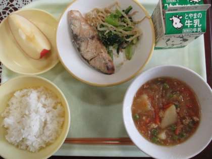 今日の献立は、ごはん、牛乳、ふくらぎの西京焼き、小松菜のごま和え、じゃが芋のそぼろ煮、りんごです。