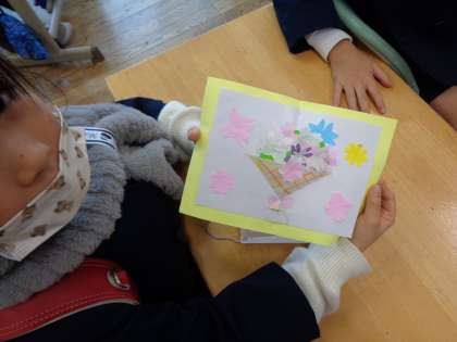 明日は、勤労感謝の日ということで、家族に『サプライズ感謝カード』を作りました。画用紙と折り紙を使って、飛び出る花束のカードを作り、丁寧にメッセージを書きました。細かい作業に、みんな手こずっていましたが、手伝い合いながら全員完成させることができました。「明日まで、気づかれないように隠しておかなきゃ!」「早く渡したい!楽しみ!」と胸を弾ませながら帰りました。
