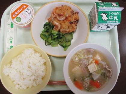 今日の献立は、「学校給食とやまの日」の献立です。しろえびのかき揚げや富山産の食材がたくさん入った富山豚汁、こんぶ和え、富富富のお米ムース等です。美味しくいただきました。