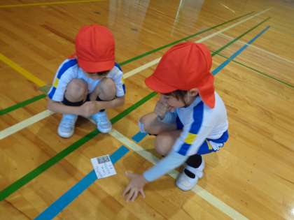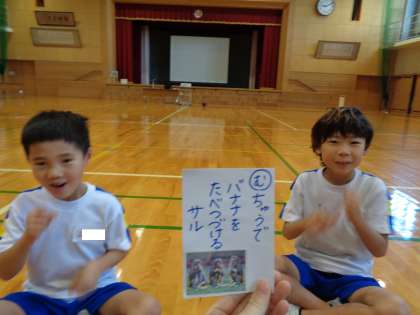 体育科では、『わくわく 岩瀬どうぶつ園』と題して、表現活動を行っています。ペアごとに動物かるたを引き、出た動物になりきります。なりきり名人、変身名人を目指して、体と心を使って表現するのが上手になってきました。