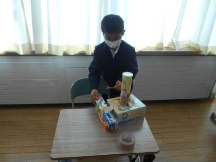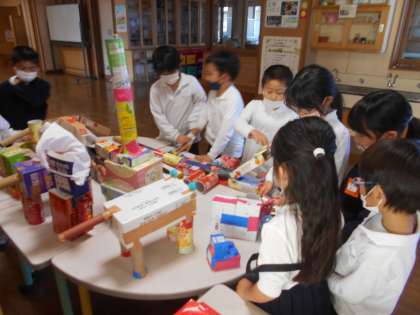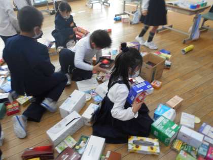 図工の学習で、箱を使って色や形など、どの箱を使うかを考えながら作品作りを行いました。