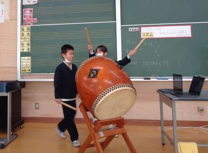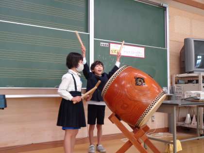 音楽科では、自分で作った太鼓のリズムをペアの人と繋げて発表しました。最初は上手に叩けず、叩くことを嫌がっていた子供たちも、練習を重ねると自信をもって叩けるようになりました。「そーれ!」のかけ声で始まり、「やー!」のかけ声で終わるという流れの中で、ペア独自の工夫も取り入れ楽しく発表することができました。