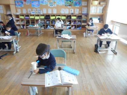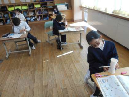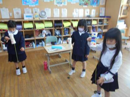 生活科の時間に、松ぼっくりけんだまをつくりました。できあがった後、みんなで遊びました。