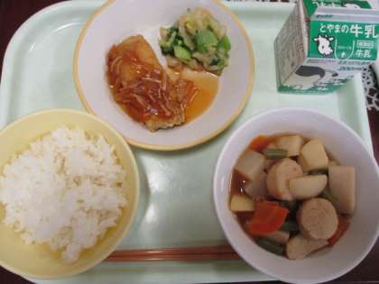 12月になりました。予報どおり寒い一日で、一気に本格的な冬がやってきた感じです。今日の献立は、ごはん、牛乳、魚の黒酢あん、白菜ひたし、関東だきです。