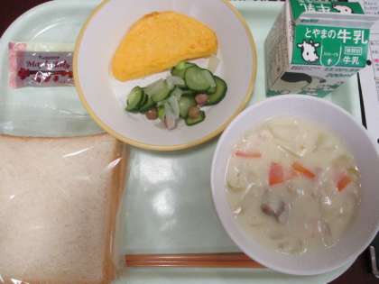 今日の献立は、食パン、牛乳、オムレツ、ミックスビーンズのマリネ、クリーム煮、メープルジャムです。
