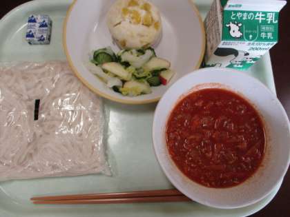 今日の献立は、ソフト麺、牛乳、ソフト麺のミートソースかけ、蒸しパン、白菜とりんごのサラダ、ポケットチーズです。