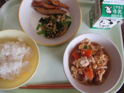 今日の献立は、ごはん、牛乳、きびなごのから揚げ、納豆和え、親子煮です。納豆和えは納豆とたくあんがとても美味しかったです。