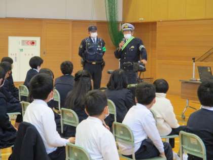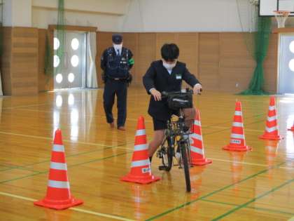上学年の交通安全教室では、自転車の点検をすることの大切さや自転車乗車のルールについて教えていただきました。自転車の技術を高めることも大切だとお話され、実際に代表の児童が自転車に乗ってジグザグ走行を体験してみました。