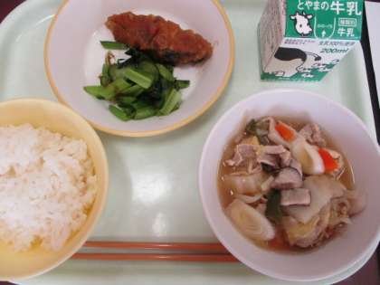 今日の献立は、ごはん、牛乳、ふくらぎのみぞれがけ、とろろこんぶ和え、白菜鍋です。「ふくらぎ」とは、ぶりの幼魚のことで、富山ならではの呼び方です。今日は、みぞれがけで食べました。