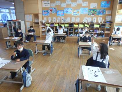 書き初めの練習を始めました。硬筆墨の持ち方や下敷きの使い方、文字の気をつけるところの話を聞いた後、お手本をよく見て書きました。