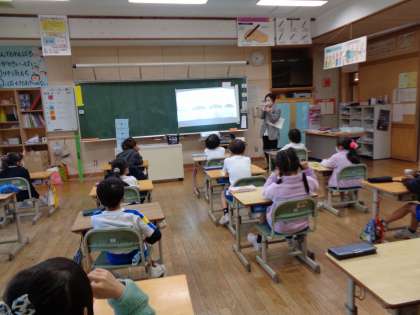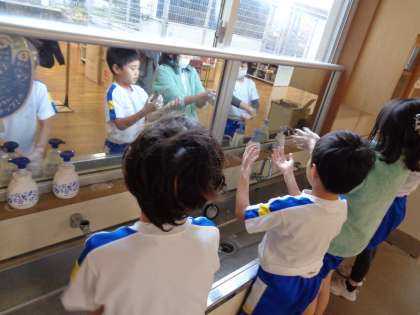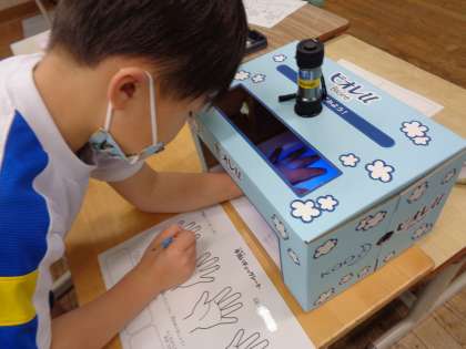 今日は養護教諭による保健の授業を行いました。テーマは『手の洗い方について』です。手洗いをしないとどうなるのか、また正しい手の洗い方とはどうなのかを詳しく教えてもらいました。そして、実際に手を洗ってみた後、ブラックライに当てて手の洗えていないところを見える化しました。「うわ、こんなにもいっぱい!」と洗い残しがあることにみんな驚いており、最後には「汚れの残りやすいところに気をつけて手洗いをしたい」と感想を書いていました。