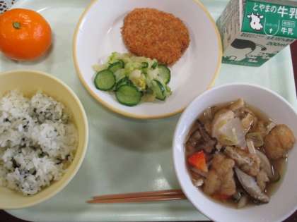 今日の献立は、わかめごはん、牛乳、かぼちゃコロッケ、柚子あえ、冬至の根菜汁、みかんです。根菜汁は体が暖まりました。